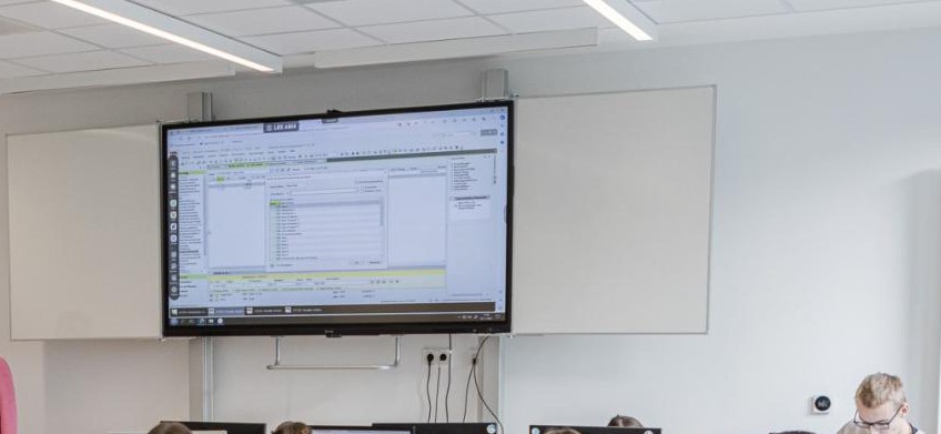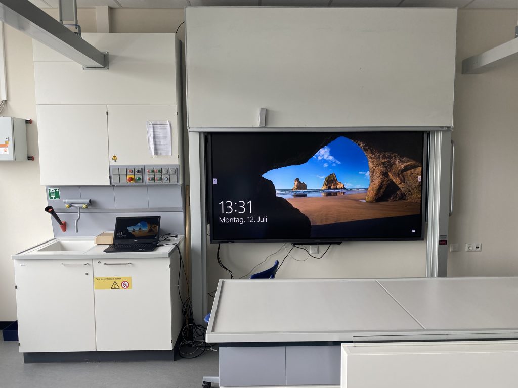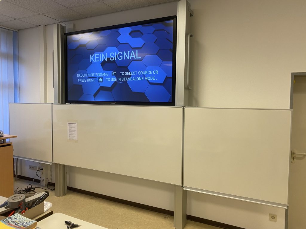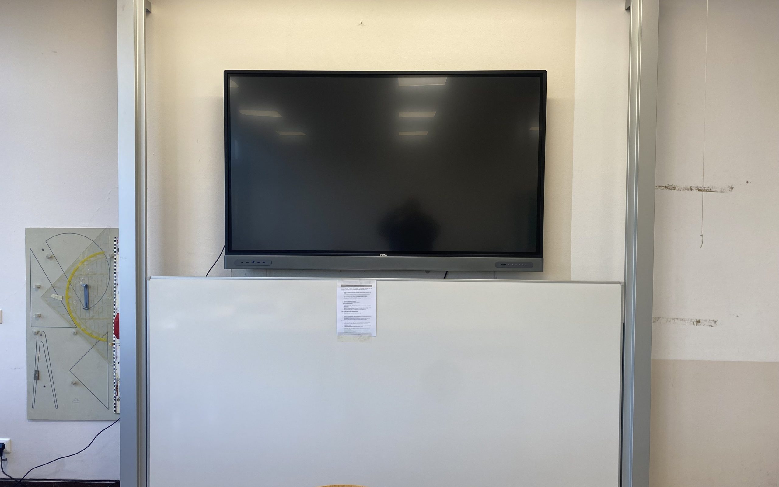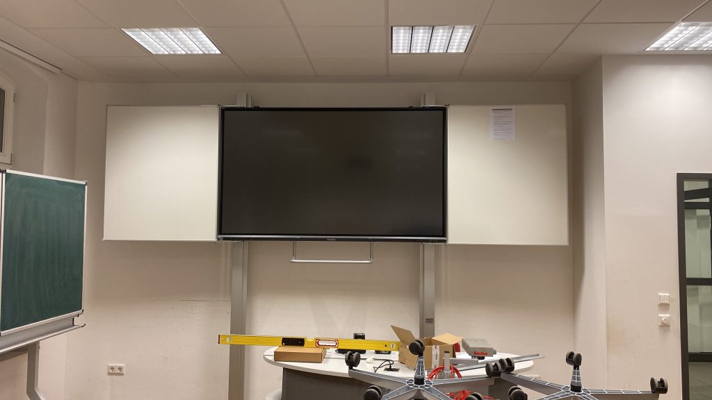 Montage von 12 Newline Mira86″ Touchscreens auf Remonta Höhenverstellung RDFS (Doppelpylone) im NaWi-Trakt eines Neubaus, weiterhin Umbau von 10 interaktiven Whiteboards aus einem Bestandsgebäude in die Klassenräume im Neubau