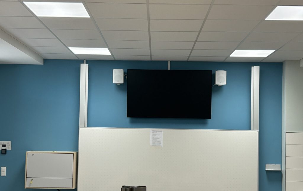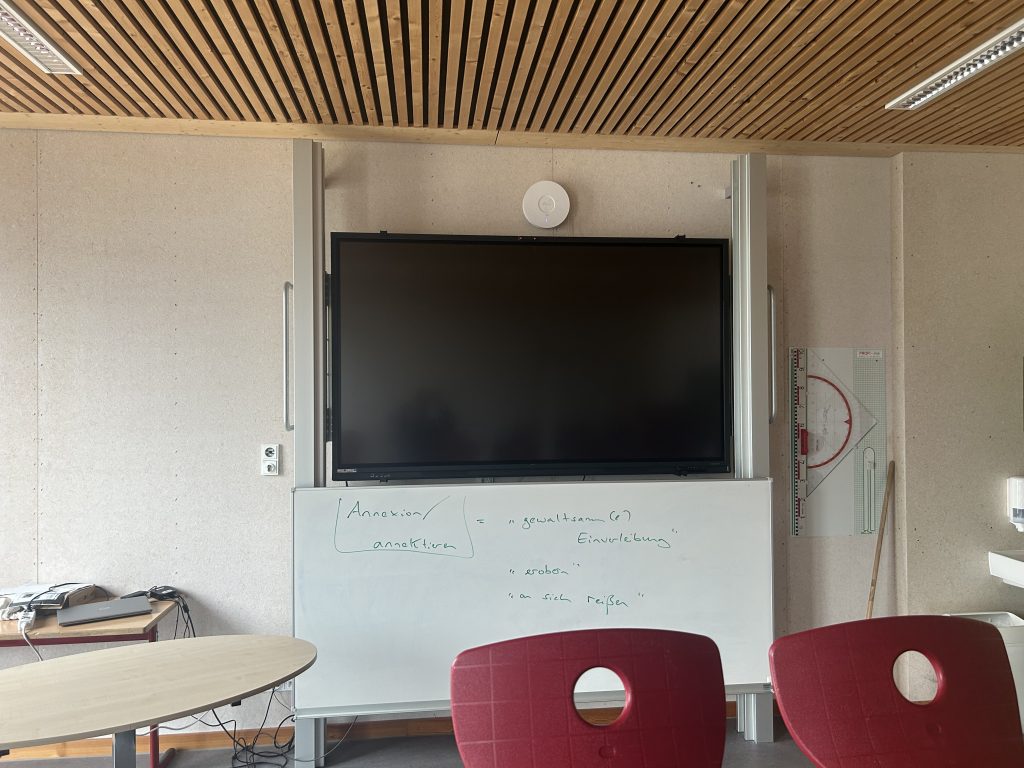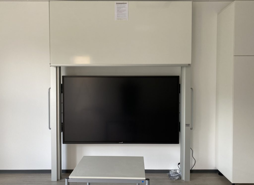 Montage diverser Legamaster Discover 75″ hinter vorhandenes Tafelsystem, Montage Wandschrank, Lautsprecher, Verkabelung