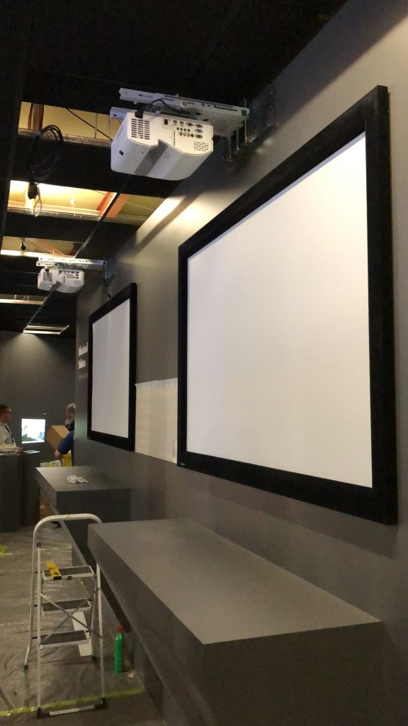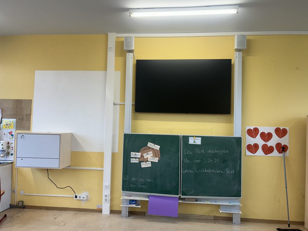 Montage diverser Viewsonic 65″ Displays hinter neuer Tafelanlage EFS 300x120cm von Remonta, Lautsprecher, Wandschrank incl. Verkabelung
